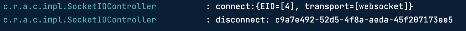 서버 로그에서는 다음과 같이 WebSocket을 사용해서 Socket.IO 연결이 이루어지고 연결 해제에 따른 로깅도 잘 적용되는걸 확인할 수 있습니다.