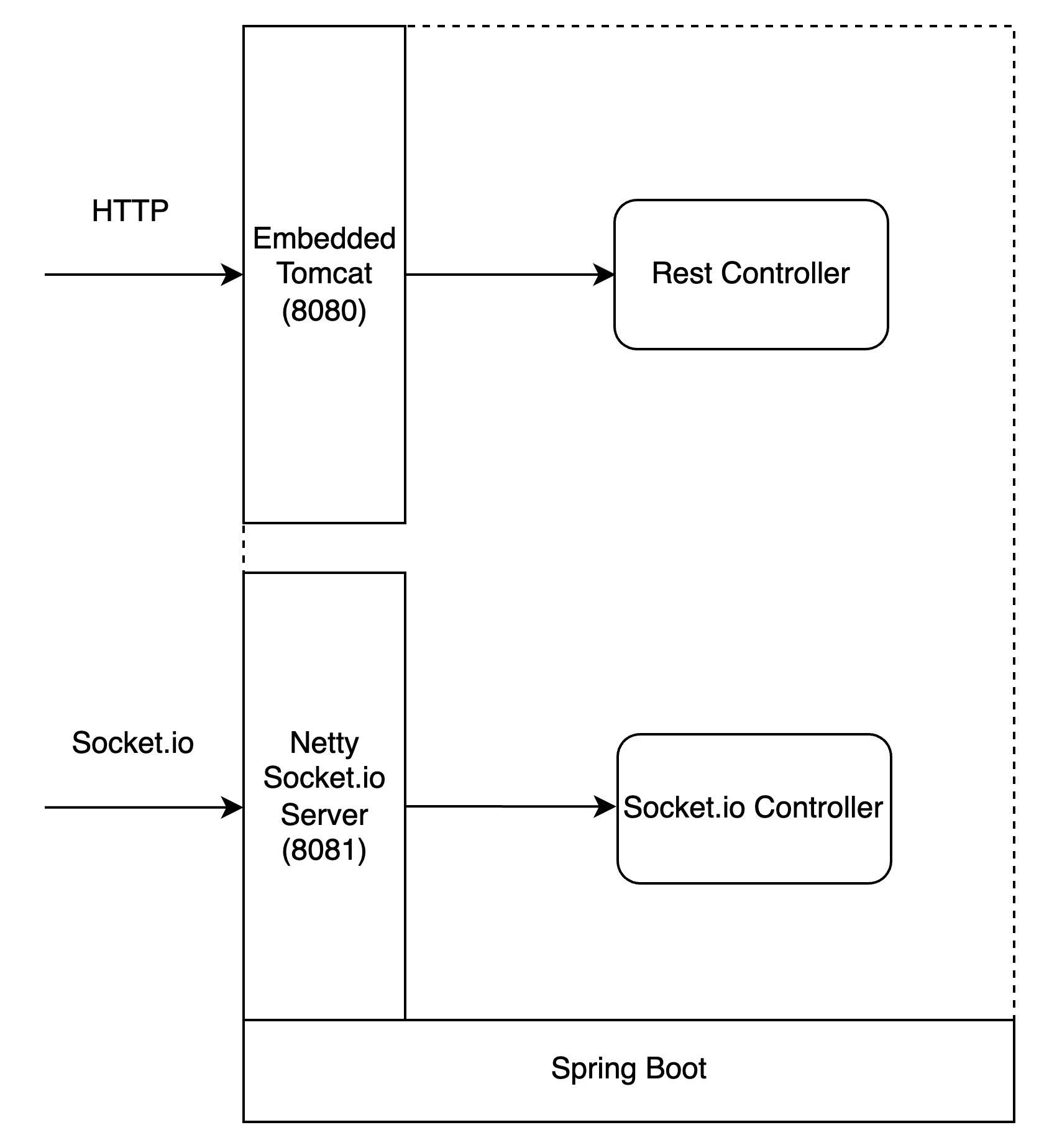 다음으로는 Socket.IO 서버를 만들어야 합니다. netty-socketio는 이름값처럼 Netty 서버를 사용해서 만들어진 기술이기 때문에 서버를 별도로 띄워야 하기 때문입니다. Netty 기반의 Webflux를 사용하면 해당 러닝커브를 감당해야 하고, 이게 또 스프링 공식 라이브러리가 아니어서 netty-socketio의 SocketIOServer를 별도로 띄우는게 아니라 프로젝트에 통합하려면 정말 깊은 이해가 필요할 것입니다. 이러한 점에서 스프링 부트에서 별도의 SocketIOServer를 빈으로 띄워보도록 하겠습니다. 구조를 그려보면 아래와 같습니다.