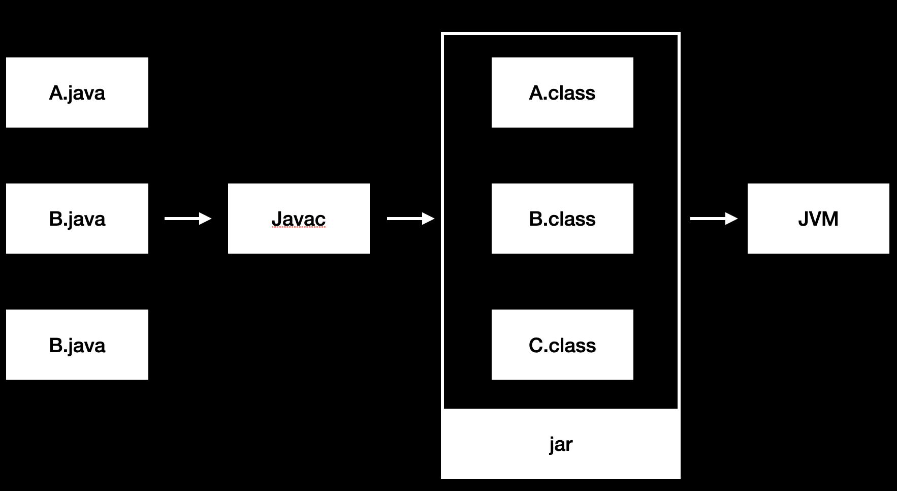 그림으로 표현하면 다음과 같습니다. 개발자는 .java 파일을 작성하고 Javac 컴파일러를 통해 .class 바이트코드로 컴파일을 수행합니다. 그리고 jar 방식으로 패키징을 수행하기도 하는데요, 이렇게 컴파일된 바이트코드를 JVM으로 전달하여 인스트럭션별로 런타임에 실행을 하게 되는 것입니다.